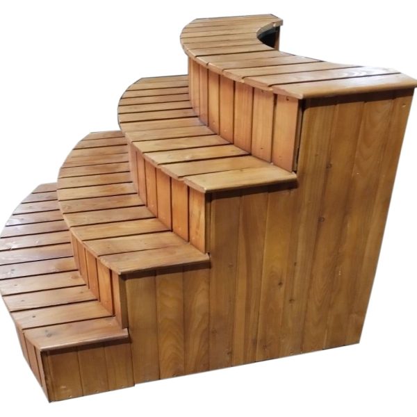 Сходинки для входу в купель виготовлені з дерева на металокаркасі. Красиві і не вимагають особливого догляду. Покриті водовідштовхувальною фарбою в тон базової обробки. Єдність матеріалу і вдало підібрані елементи роблять конструкцію міцнішою, забезпечують необхідну жорсткість і зносостійкість.